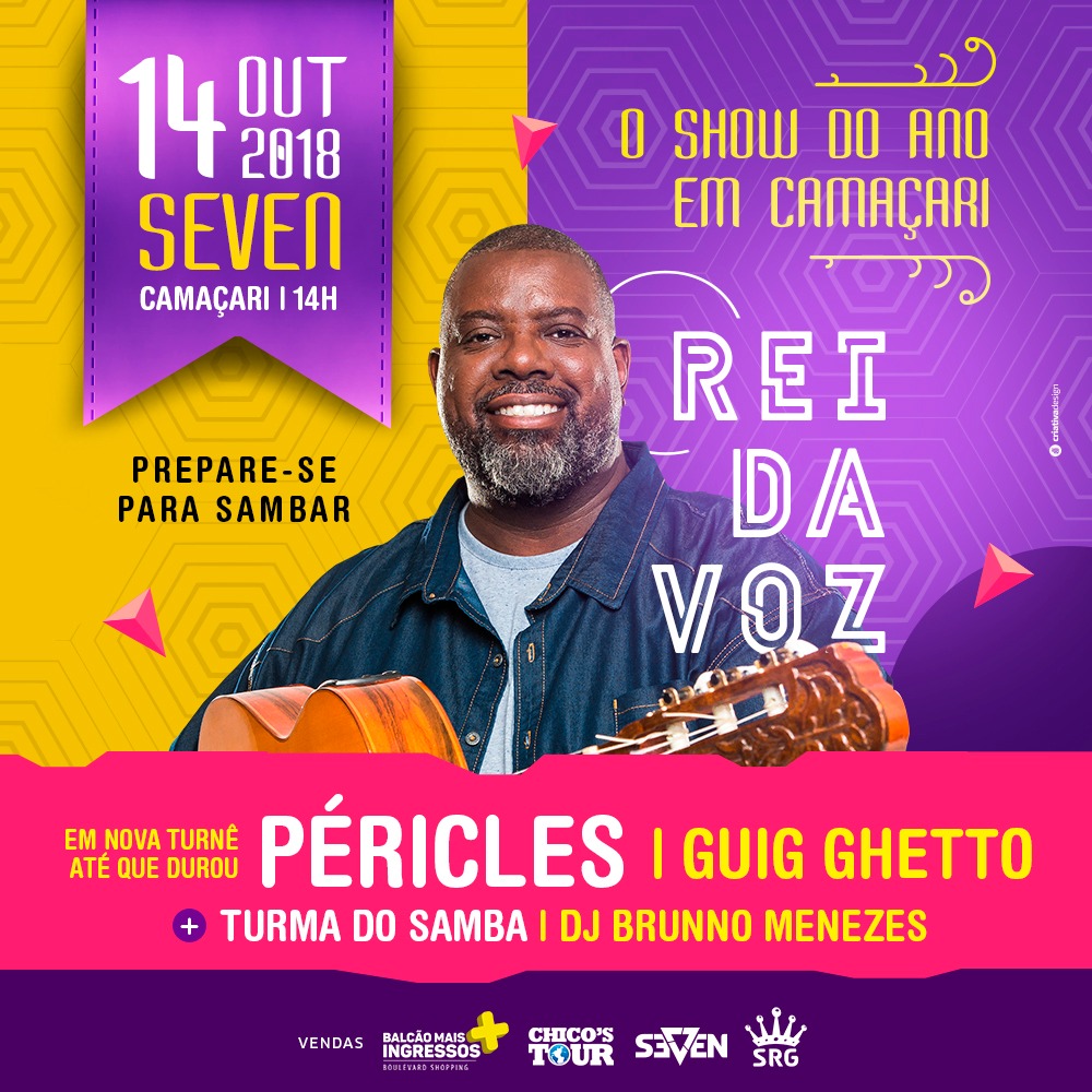 A voz mais bonita do Brasil tem um encontro marcado com Camaçari, dia 14 de outubro, na Seven Music Hall, o cantor Péricles vai fazer um show exclusivo na cidade. Além do sambista, são presenças confirmadas na festa, a banda Guig Ghetto, o grupo Turma do Samba e o Dj Brunno Menezes.