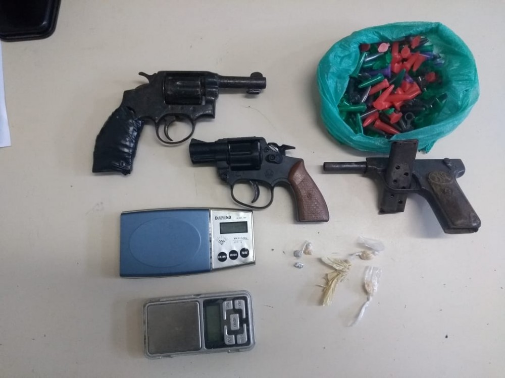 No barraco foram apreendidos um revólver calibre 38, uma pistola 635, um simulacro de arma de fogo, seis pedras de crack, duas balanças e pinos para armazenar entorpecentes. Todo o material foi apresentado na 18ª Delegacia Territoria (DT/Camaçari).