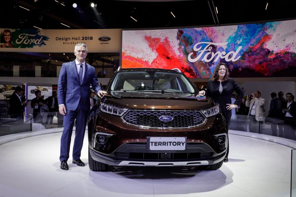 Os SUVs são os astros da Ford no salão, com três grandes atrações. O novo Edge ST, primeiro carro a trazer para o Brasil a grife "Sport Technologies" de carros de alto desempenho da Ford, terá a pré-venda iniciada durante o salão. O EcoSport Titanium sem o estepe na traseira é outra grande novidade que chega em breve às ruas. Já o Territory, novo SUV médio global repleto de tecnologia, desenvolvido na China, é apresentado como conceito. "O Territory é uma inovação que combina o DNA global e expertise tecnológica da Ford no design, engenharia e fabricação de veículos com a competitividade da China. Ele é uma prova chave de como vamos crescer com alta qualidade e custos eficientes", afirmou Lyle Watters.O Mustang de nova geração, equipado com um arsenal tecnológico de respeito e cavalaria pesada sob o capô, tem lugar de destaque no estande. Os fãs poderão ver três Mustangs GT Premium, um deles em versão especial tunada de 1.000 cv. A F-150 Raptor, picape off-road de alta performance, é apresentada na versão 2019, com novas tecnologias de controle. Na área de carros elétricos a Ford traz o Fusion Energi, versão híbrida plug-in do sedã com bateria de nova geração que também pode ser recarregada na tomada.