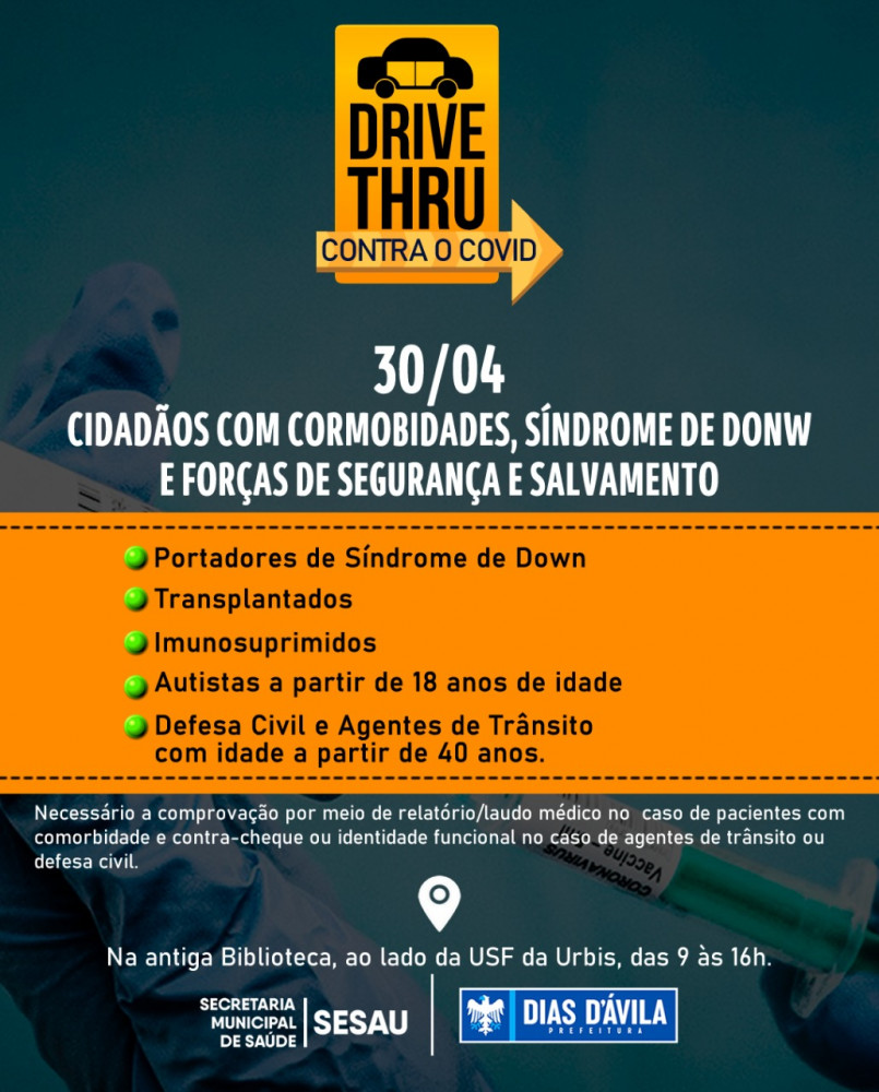 Com o recebimento de 1050 novas doses de vacinas contra o Covid-19, a Prefeitura de Dias d’Ávila inicia nesta sexta (30/04), uma nova etapa do processo de imunização.