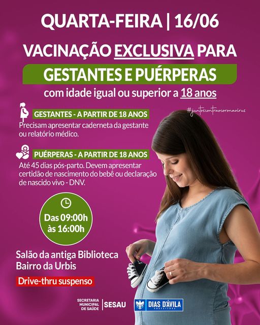 A prefeitura de Dias d’Ávila informa que nesta quarta-feira (16), a vacinação contra a Covid-19 será EXCLUSIVA para GESTANTES e PUÉRPERAS com idade igual ou superior a 18 anos.