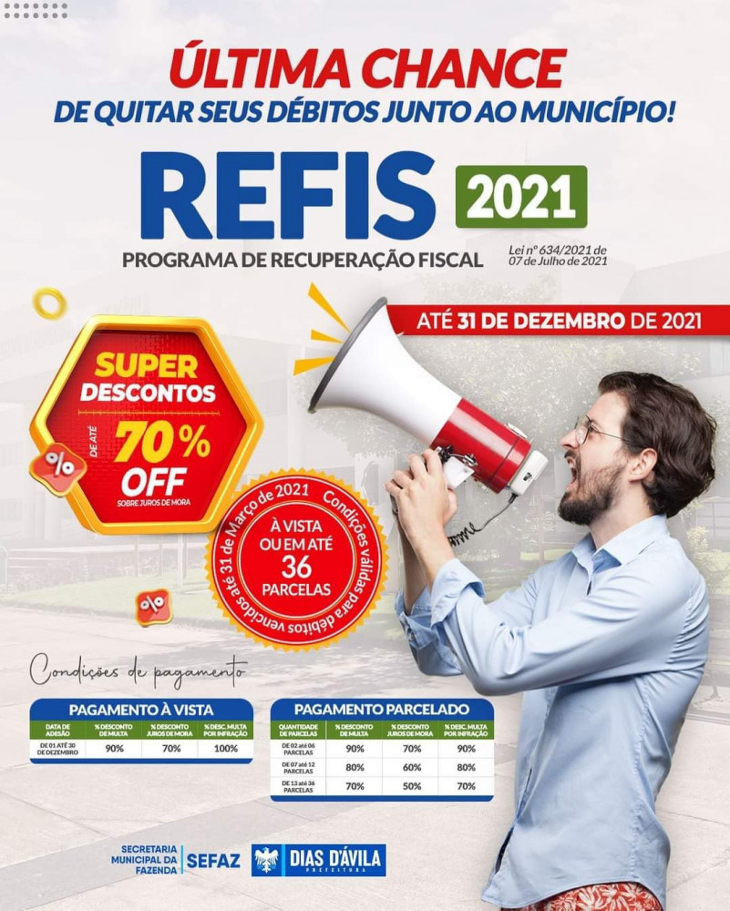 A Prefeitura de Dias d'Avila, através da Secretaria da Fazenda, convoca os contribuintes que ainda não regularizaram seus débitos no Programa de Recuperação Fiscal - REFIS 2021.