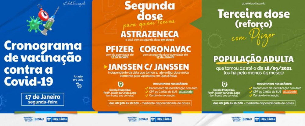 Além disso, a população adulta que tomou D2 até o dia 18/09/2021 (ou há pelo menos 04 meses) poderá completar o ciclo com a dose de reforço.