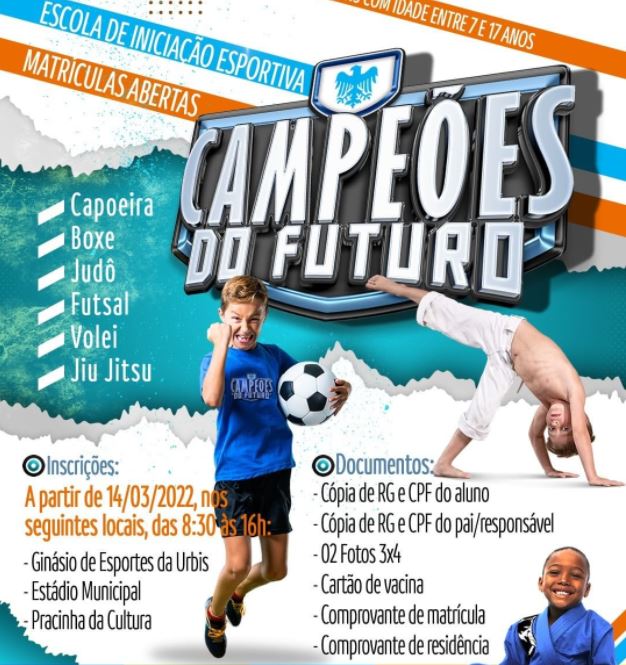A Prefeitura Municipal de Dias d'Avila, por meio da SEMEC, apresenta o projeto de iniciação esportiva CAMPEÕES DO FUTURO, que garantirá aos jovens da nossa cidade com idade entre 7 e 17 anos, a prática de diversas modalidades esportivas, sob orientação de professores experientes e altamente capacitados.