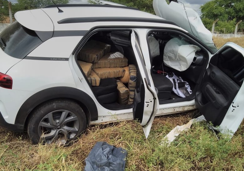 A Polícia Militar encontrou 247 kg de maconha prensada na região da cidade de Filadélfia, no norte da Bahia. A droga era transportada nos bancos de um carro e o motorista conseguiu fugir.