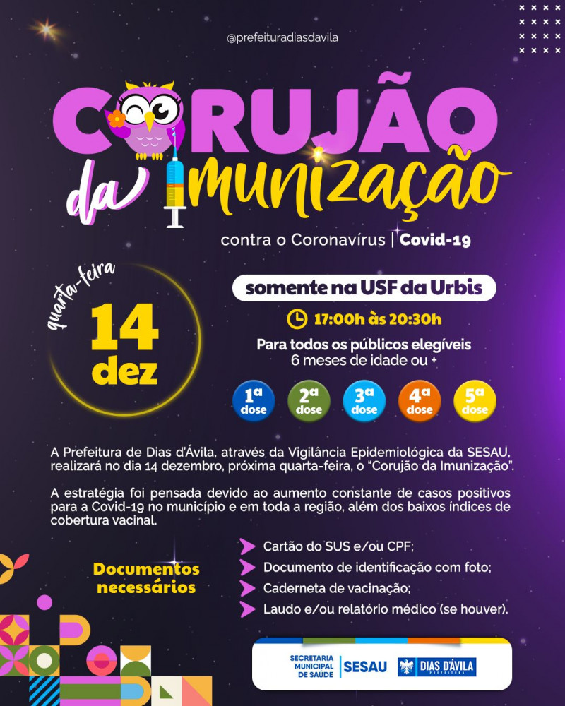 A Prefeitura de Dias d'Ávila, através da Vigilância Epidemiológica da SESAU, realizará, na próxima quarta-feira (17), o "Corujão da Imunização”.