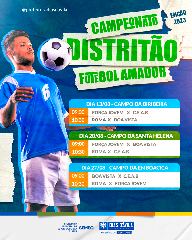 4 equipes entrarão em campo: Força Jovem e C.E.A.B. da Biribeira, Roma da Emboacica e Boa Vista de Santa Helena. Os distritos vão tremer com a emoção do futebol!