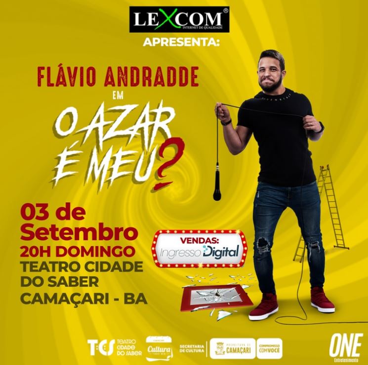 No espetáculo: ” O Azar é meu?” , o humorista Flávio Andradde passeia por diversas histórias azaradas da sua vida, com observações curiosas sobre momentos que tinham tudo para dar errado e no final se tornaram uma grande piada. Observações da vida, relatos azarados no amor, e até uma pitada de música, formam esse espetáculo onde o azar é só um pretexto para sabermos que tudo na vida pode nos fazer sorrir.