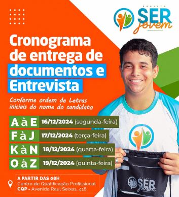 A partir desta segunda-feira, 16 de dezembro, os candidatos selecionados para o Projeto Ser Jovem devem comparecer ao Centro de Qualificação Profissional (CQP) para a entrega da documentação obrigatória. O processo seguirá o cronograma estabelecido no Diário Oficial Nº 2506, publicado no dia 29 de novembro de 2024.
