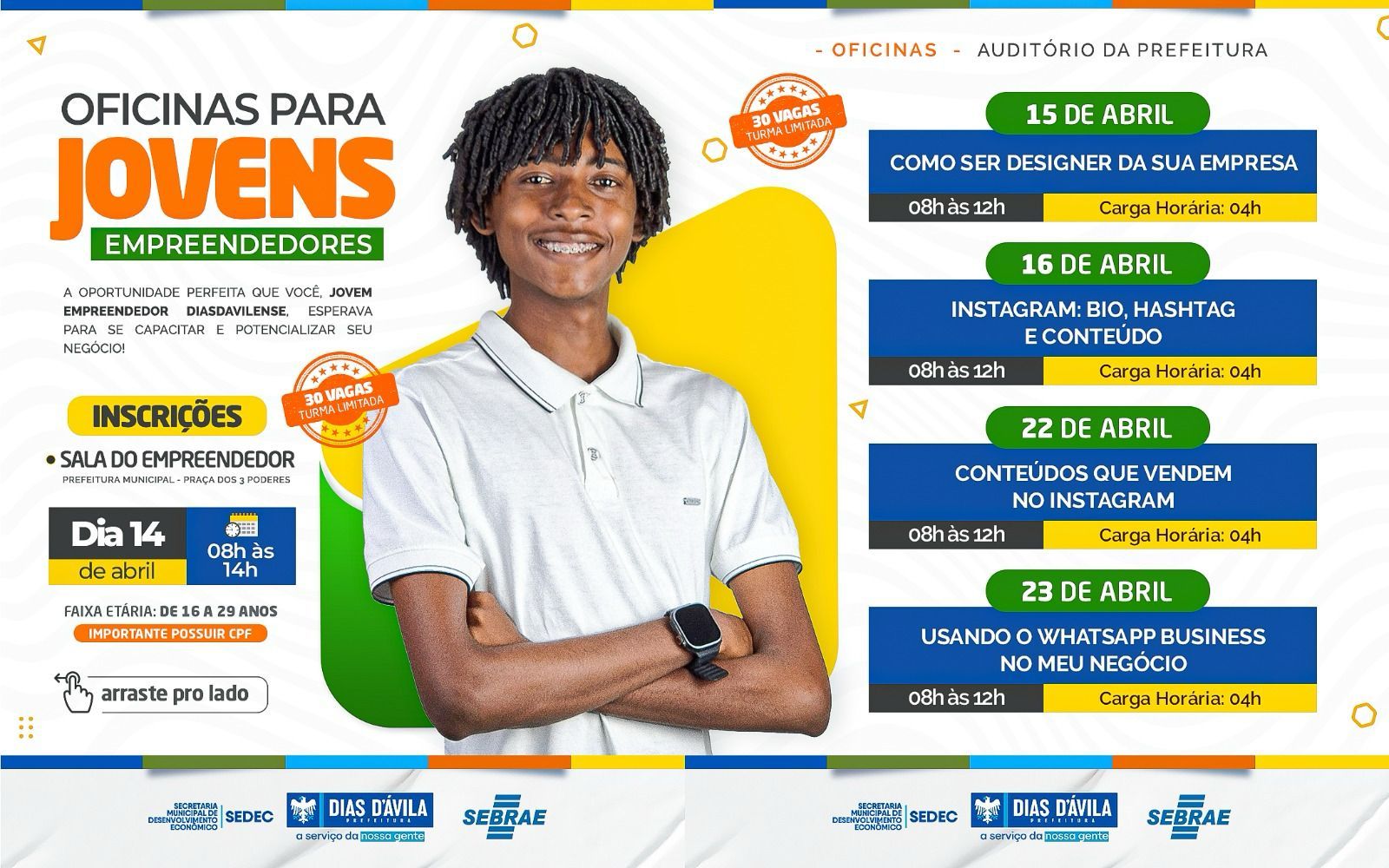 A Prefeitura de Dias d’Ávila, através da Secretaria de Desenvolvimento Econômico (SEDEC) e da Sala do Empreendedor, vai realizar nos dias 15, 16, 22 e 23 de abril as Oficinas para Jovens Empreendedores, no Auditório da Prefeitura.