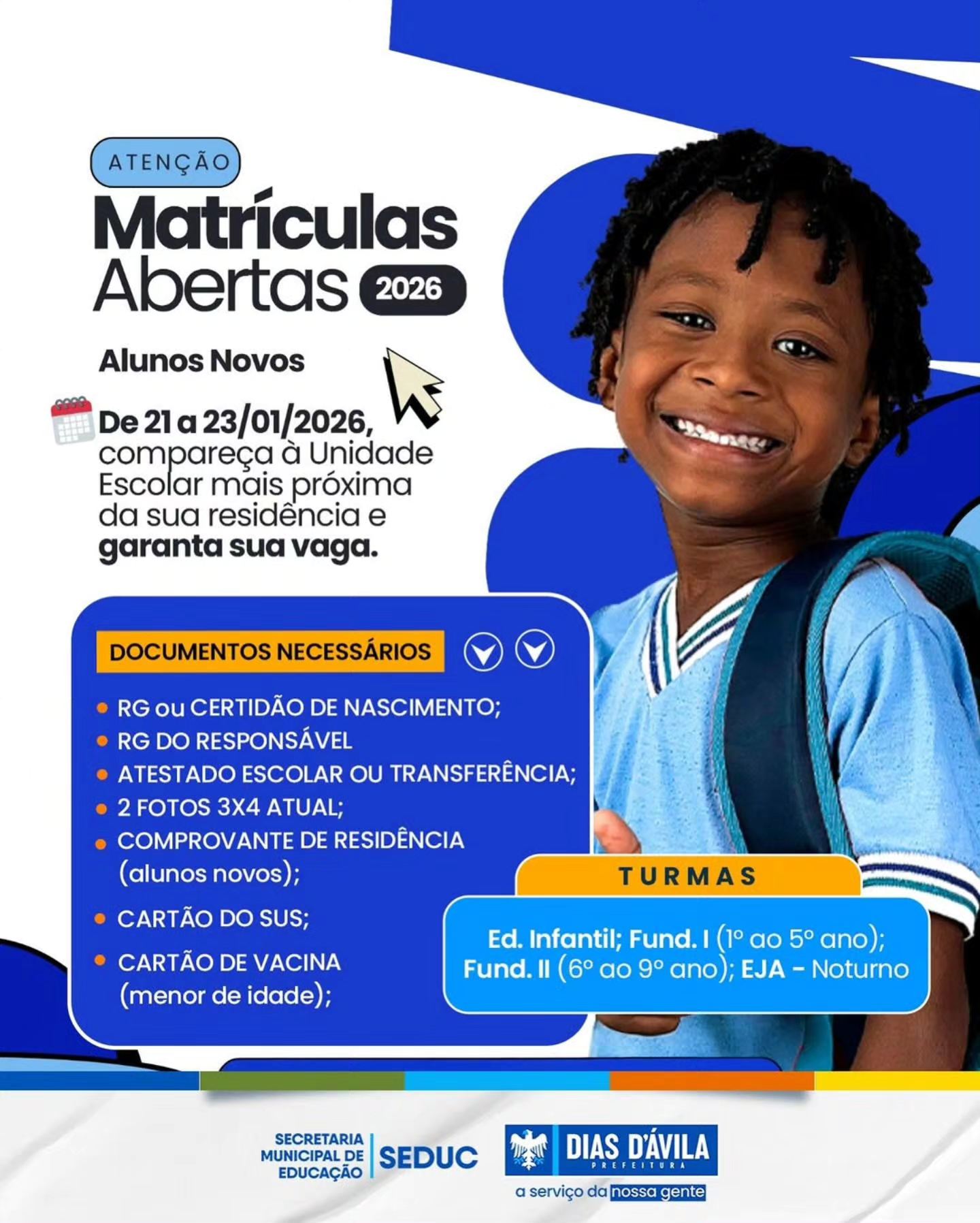 Atenção, pais e responsáveis! A Prefeitura de Dias d’Ávila anunciou o período de matrículas para novos alunos da Rede Municipal de Ensino.