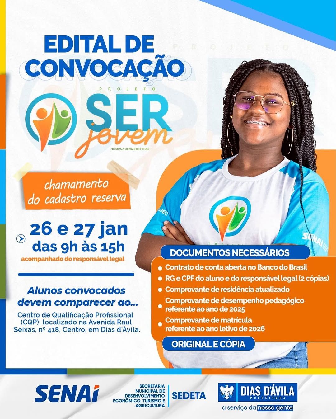 A Prefeitura, por meio da SEDETA, convoca o 2° grupo do Cadastro Reserva do Projeto Ser Jovem.
