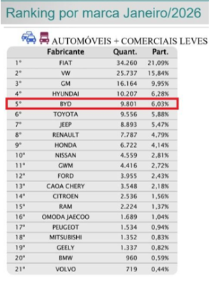 Com menos de quatro anos de atuação no Brasil, a BYD é, pelo segundo mês consecutivo, a quinta marca de automóveis que mais vende no país. Em janeiro, a greentech a emplacou 9.801 veículos no total, uma média de 460 carros eletrificados comercializados por dia. O volume de vendas foi quase 50% superior ao mesmo período de 2025.
