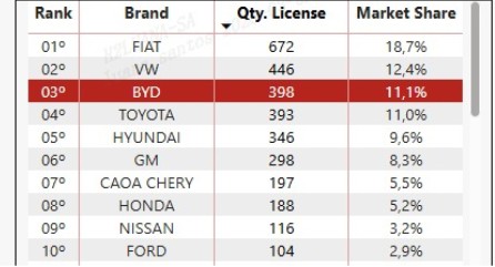 "A curva de crescimento da marca no país impressiona e esse salto, apesar de vir em um curto tempo, é parte de um legado que vem sendo construído desde nossa chegada e uma extensa divulgação das tecnologias eletrificadas. Em fevereiro de 2024, a BYD ocupava a 10ª posição, com pouco menos de 3% de participação. Um ano depois, no mesmo período, já éramos a 9ª marca mais vendida do Brasil, com pouco mais de 5% de participação no mercado", comemora Tyler Li, presidente da BYD no Brasil.