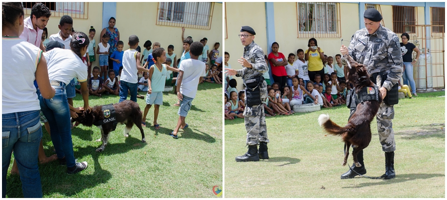 Durante o evento, através de momentos lúdicos e de grande interação, foi feita uma apresentação em que os soldados, de posse dos cães, puderam demonstrar um pouco do trabalho que é realizado no dia a dia como treinamento, utilização dos cães em praças esportivas e também no combate as drogas.
