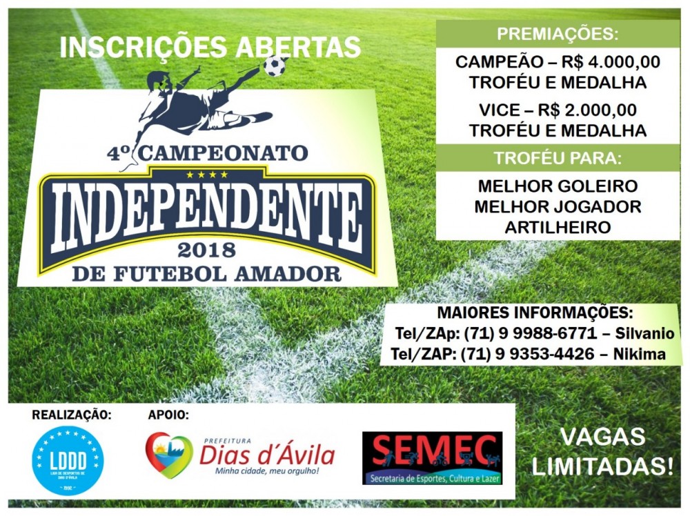 A Prefeitura Municipal de Dias d'Ávila, através da Secretaria de Esporte e Cultura (SEMEC) e Liga de Desportos de Dias d'Ávila (LDDD) informa que as inscrições para o 4º Campeonato Independente de Futebol Amador 2018 estão abertas. As vagas são limitadas.