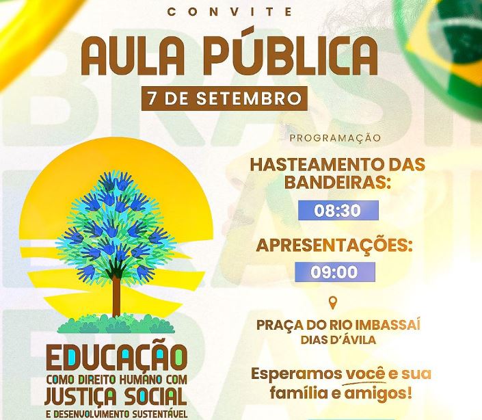 Neste sábado, 07 de setembro, a partir das 8:30h, a cidade de Dias d’Ávila sediará a Aula Pública 07 de Setembro na Praça do Imbassay. Este evento, promovido pela Prefeitura Municipal de Dias d´Ávila, através da Secretaria Municipal de Educação - SEDUC, conta com a participação das Escolas e Projetos da Rede Pública Municipal de Ensino, e outras Instituições locais. Será uma importante oportunidade para discutir e reafirmar a educação como um direito humano essencial para a construção de uma sociedade justa e sustentável.