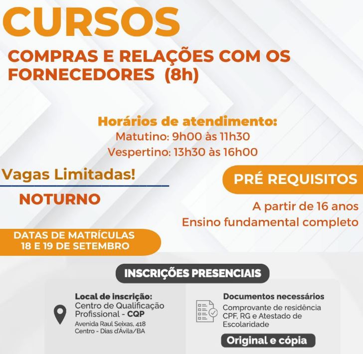 A Prefeitura Municipal de Dias d'Ávila, através da Secretaria de Desenvolvimento Econômico (SEDEC), está com matrículas abertas para dois novos cursos de qualificação profissional em parceria com o Serviço Nacional de Aprendizagem Industrial (SENAI). Até o dia 19 de setembro, os interessados poderão se inscrever nos cursos de Compras e Relações com Fornecedores e Técnicas de Negociação, ambos no turno noturno. As matrículas devem ser realizadas no Centro de Qualificação Profissional (CQP), localizado na Av. Raul Seixas, nº 418, no centro da cidade, das 9h às 11h30 e das 13h30 às 16h.