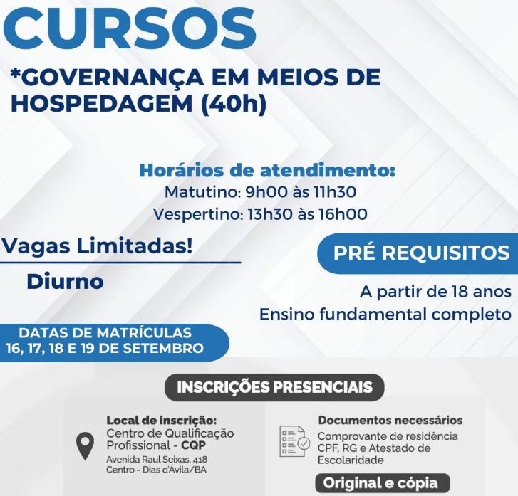 Além disso, a Prefeitura informa que as matrículas para o curso de Governança em Meios de Hospedagem, oferecido em parceria com o Serviço Nacional de Aprendizagem Comercial (SENAC), foram prorrogadas até o dia 19 de setembro. Esse curso, que será realizado no turno diurno, é voltado para pessoas com idade mínima de 18 anos e ensino fundamental completo.