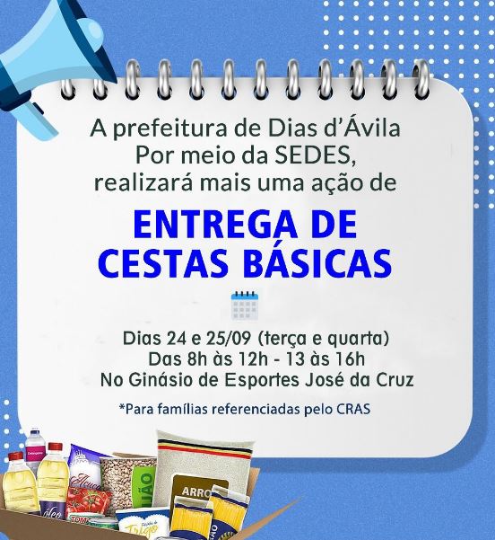 A Prefeitura de Dias d’Ávila, por meio da Secretaria de Desenvolvimento e Proteção Social (SEDES), realizará mais uma ação de entrega de cestas básicas no município. Nos dias 24 e 25 de setembro (terça, e quarta-feira).