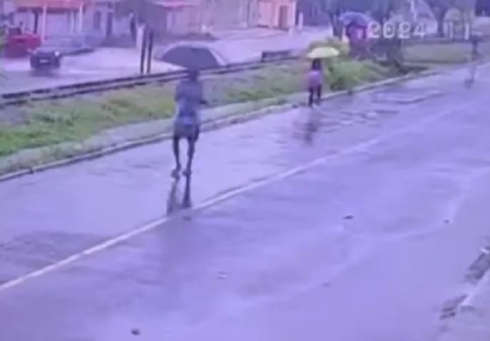 Amanda estava saindo sozinha da escola e segurava um guarda-chuva amarelo, quando desapareceu na água. A cena foi registrada em vídeo por testemunhas por volta das 12h22, mostrando o momento exato da queda. Logo após, um carro passou pelo local, com as rodas submersas devido ao grande volume de água que havia